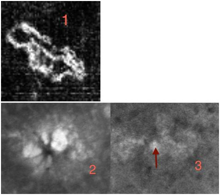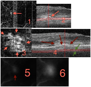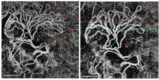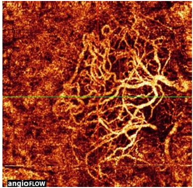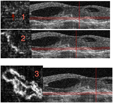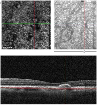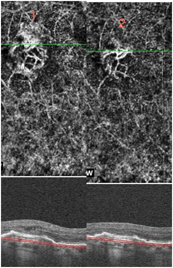 The process of Angio-OCT is very simple, it needs nearly the same cooperation and acquisition time than a common OCT, we can consider that this method could be extend nearly at every on Angio-OCT is motion and eye blink sensitive, but the correction of these parameters are really efficient with the news software’s, we can carry out Angio OCT in 9 cases on 10. First is a normal subject, 75 old (Figure 1), to be schematic in this presentation you can observe 4 different layers, two retinals: superficial and deep which is more medial (inner plexiform layer) and two choroidal: external retina with retinal pigment epithelium (RPE) and choriocapillaris (CC). The accuracy of the picture is real, you have a very good visualization of the peri foveolar capillaries, you discover the deep retinal vessels, densest and twisted, and then you reach the external retina avascular layer, to finish with the CC dapple-grey aspect. You can compare with OCT images to complete your diagnosis, and the level of the layer is showed on the OCT (between red and green line reported on the OCT). The first very enthusiastic Angio OCT are provided by wet complications of macular degeneration.