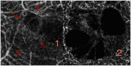 SSADA use the natural flow as the target of the algorythm, and then, we don’t need any injection of any dye to obtain the image of retinochoroidal vascular network. The flow is detected by comparison of same acquisitions in differents times. SSADA algorythm is based on amplitude decorrelation.5 The decorrelation depends on autocorrelation (comparison of a signal with itself) and cross correlation (comparison at different time), the difference between these different signals as the variation with the time of the speckle pattern permit to detect the flow in the vessels. On the other hand than doppler techniques, based on phase analysis, SSADA aim to analyze amplitude decorrelation and is able to detect motions in axial and transverse direction, doppler OCT is only capable to measure axial flow velocity.