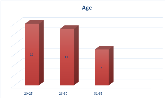 Figure 1 shows that, rate of different age groups. Age are divided in to three groups. 1st group included 20-25 year, 2nd group included 26-30 and 3rd included 31-35 year of age. Bar chart showing that total 12(40%) of patients are with age 20-25 years so group 1 has highest rate. Then 2nd group has highest rate because 11(36.7%) patients are with age ranging from 26-30 years then 3rd group very low number of patients only 7 (23.3%) were including in this study with age 31-35 years.