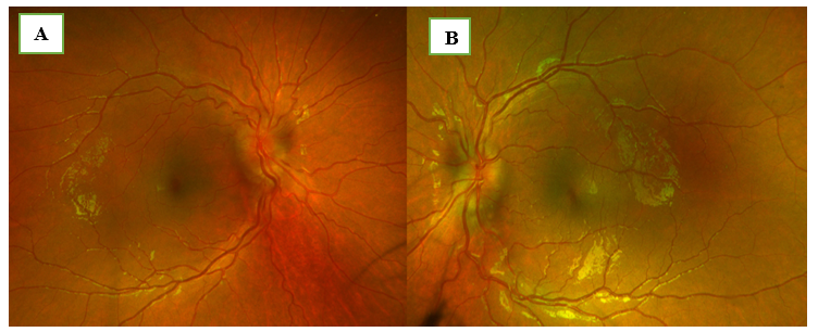 Figure 1 Fundus photography: Optos image of the right eye (A) with Frisen grade 3 optic disc edema and of the left eye (B) with Frisen grade 2 optic disc edema.