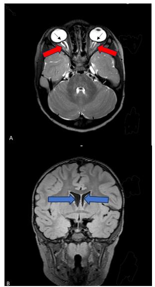 Figure 2 MRI imaging Axial 3D T-2 weighted MRI image depicting posterior globe flattening (black arrows) bilaterally and prominent cerebral spinal fluid in the optic nerve sheaths (red arrows) (A). Coronal 3D FLAIR MRI image demonstrating normal ventricle size (blue arrows) (B).