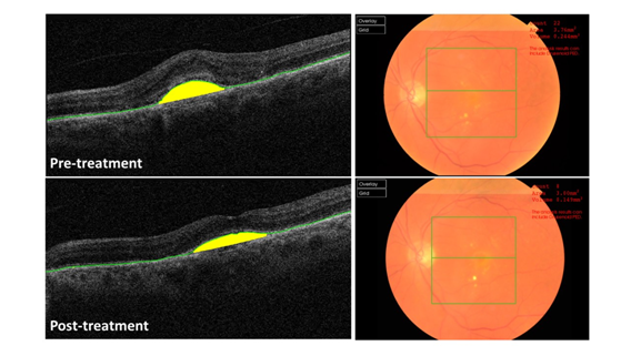Figure 2 OCT software identification of CNV lesions showing automatic delineation of the RPE and accompanying fundal view A) Pre-treatment and B) Post-treatment.