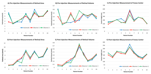 Figure 3 OCT automatic versus manual segmentation of two blinded observers. Pre-treatment measurements of A) Retinal area, B) Retinal volume, C) Foveal center thickness. Post-injection measurements of D) Retinal area, E) Retinal volume, F) Foveal center thickness.