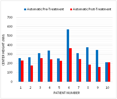 Methodology: A retrospective study of 10 macular degeneration patients diagnosed with CNV. Blinded observers, trained to detect changes on OCT, delineated boundaries of CNV lesions using SD–OCT (Topcon 2000) with automated software and then modified segmentation manually before and after loading dose Ranbizumab injections. Automated measurements were then compared to manual segmentation values. Statistical analysis was performed, taking into account inter–observer variability.