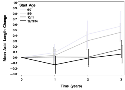 As children get older, the rate of axial length change decreases for those who wear glasses or Ortho-K. But, children who start Ortho-K younger have the largest reduction in axial length change vs. children wearing glasses. In this study, children who started Ortho-K at age 6-7 showed a mean increase of 0.57mm in axial length over a 3 year period compared to spectacle-wearing children in a study by Hyman et al.,33 who showed 1.10 mm of axial length increase in three years. In contrast, the 10-11 year-old Ortho-K wearers in our study showed0.15 mm axial length increase versus 0.50 mm of axial length increase in the 11 year-old spectacle wearers. As a reference, (Table 4) summarizes axial length change for age groups for different modes of correction.