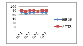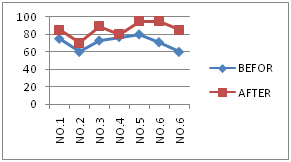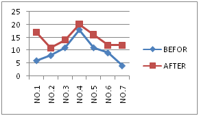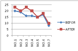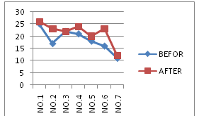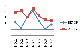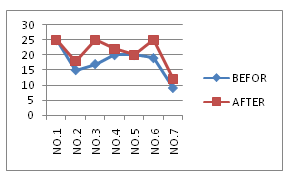 Chart 1 Visual skills and performances have shown by these charts: In these charts, Vertical lines show the scores and Horizontal lines show the athletes HCE, OD, Hand-eye coordination before training (blue line) and after training (red line) in right eye.