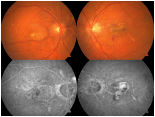 We presented a forty-two year old, Caucasian, male patient with AS without any systemic association who has complained of unilateral visual loss. His best corrected visual acuity (BCVA) was 20/20 in right eye (RE) and 20/30 in left eye (LE). Intraocular pressures (IOP) were bilateral 16 mmHg and slit-lamp anterior segment examinations were completely normal. In both eyes’ dilated fundus examination, classical AS appearance was seen in posterior pole, in addition, RPE alterations were observed both eyes while minimal hemorrhages was seen in macular region in LE. In FFA, hypofluorescence in angioid streaks borders and widespread hyperfluorescence the in macular region in both eyes. Figure 1 shows colored fundus images and FFA photographs of both eyes (Figure 1). In OCT, there were hyporeflective spaces in outer retinal layers and hyperreflective band between outer retina and RPE in both eyes. When comparing the findings of two eyes, they were seen that the lesion was parafoveal and fovea relatively spared in right eye and BCVA was 20/20 while the lesion was more subfoveal in left eye and BCVA was decreased.