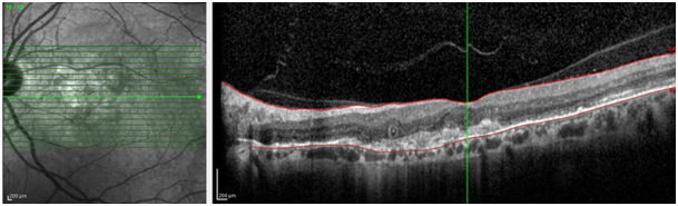 One year later, the patient presented with 20/200 BCVA without any trauma. Severe submacular hemorrhage observed on clinically and CNV was found in OCT and FFA evaluations. Hence, intravitreal ranibizumab injection switched to aflibercept therapy. Consecutive 3 injections of aflibercept were performed in one month interval. BCVA was gradually increased to 20/60, submacular hemorrhage was disappeared, macular thickness on OCT due to hemorrhage was disappeared. BCVA was remained as 20/60 even with development of slight lens opacification for one year follow-up after last intravitreal injection. In final OCT, hyporeflective spaces were resolved and legacy outer retinal tubulation was detected which can be seen in natural course of AS (Figure 2).8
