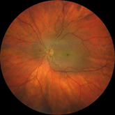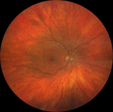 Figure 1B Fundus photo of patient’s retina showing pale posterior pole with swollen optic nerve head and macular.