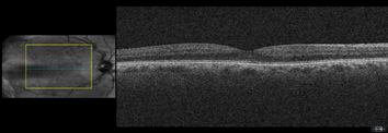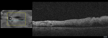 Figure 2B a slice of OCT macular cube showing pigmented epithelial detachment, and disrupted retinal layers OS.