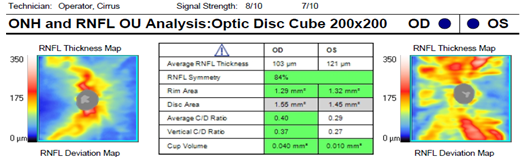 Figure 3 OCT ONH and RNFL OU analysis showed relatively normal optic nerve OD and swollen optic nerve OS.