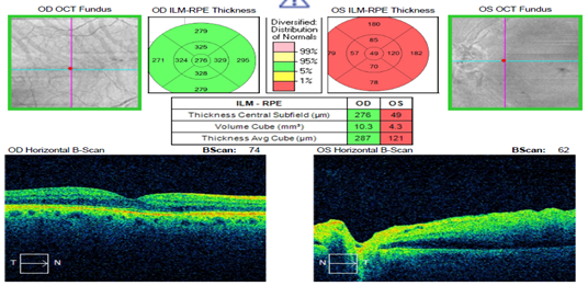 Figure 4 OCT Macular Cube 512x128 confirmed normal central thickness OD, and detached retinal layers OS.