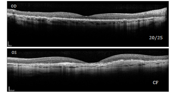 Visual acuity was measured 20/25 in the right eye and count-fingers at 5 feet in the left eye with symmetrically reactive pupils and normal intraocular pressures. Retinal examination revealed well-circumscribed scalloped areas of atrophy in both eyes (Figure 1), particularly in the outer retinal and choroidal areas. The presence of a central fibrotic CNVM was also seen in the left eye. Spectral Domain OCT showed outer retinal atrophy and subretinal fibrosis with the left eye (Figure 2) to a greater degree than the right eye. Baseline diagnostic imaging was obtained to document the pathological course. Given the presence of sub-RPE deposits noted in the retina along with discerned areas of RPE loss and choroidal atrophy in the macula and periphery, the diagnosis of L-ORD was made for both eyes.