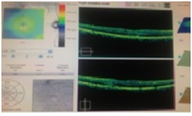 The posterior segment evaluation after dilation revealed ten punched-out lesions per eye with peripapillary atrophy in both eyes. The CD ratio was 0.35 vertical and horizontal OU. There was no diabetic retinopathy OU. When evaluating the macula, there was slight elevation OD and OS had a gray-green elevated lesion. No other ocular pathology was observed. An OCT was performed in office to confirm diagnosis; the OCT seen below confirms the presence of a CNVM OS with associated edema. The right eye had the start of a small CNVM with mild adjacent edema.