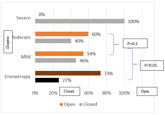 Regarding refraction, the mean refractive error was 1.6 dioptres (±1.4 dioptres), ranging from 0 to 9.25 dioptres. Graph 1 illustrates the distribution of refractive errors using the Mann-Whitney test to assess the heterogeneity of two ordinal samples. Among the participants, 65% exhibited mild hyperopia (n=229), 13% had moderate hyperopia (n=47), and 0.6% had high hyperopia. Additionally, 21% of participants were assigned to the control group (n=75). Furthermore, of the total population, 41% had a narrow angle (n=146), while 59% had an open angle (n=207) (Table 3).
