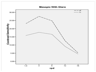 Figure 2 Contrast sensitivity scores in different spatial frequencies in mesopic conditions with glare.