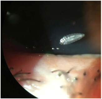 The clinical signs of ophthalmic myiasis are summarized by the signs of acute conjunctivitis. The interrogation notes a direct eye contact with a fly. This was the case in our patient. By slit lamp examination, we find larvae belonging to the oestrus or, rarely, the Rhinoestrus purpureus. It is a cosmopolitan affection but it is especially present among shepherds.3 Man, is an accidental host.