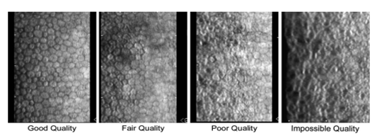 The non-contact specular microscope can capture 120-170 cells per image. The actual number of cells per image depends on the endothelial cell density, the smaller the endothelial cell density, the fewer the number of cells maximally analyzed per capture field, and the higher the endothelial cell density, the larger the number of cells analyzed per capture field for e.g. A cornea with a cell density of 2500 cells/mm2 has 118 cells in the field. Thus, 120 is the maximum number of cells that can be counted from 1 sample field. A cornea with a cell density of 1500 cell/mm2 had a maximum number of 65 cells. When the human corneal endothelium is damaged,16 the healing is a process of cellular enlargement and spreading to create a contiguous layer of cells on the inner surface of the cornea. The degree of endothelial cell loss from, for example, disease, trauma, or chemical toxicity can be documented with specular microscopy as an increase in individual cell surface area and a decrease in the endothelial cell density for the cornea. The corneal endothelial cell wound repair is also reflected as an increase in the variation of individual cell areas, i.e., polymegathism or coefficient of variation (CV). Six-sided cells are an indication of an even distribution of membrane surface tension and of normal cells.