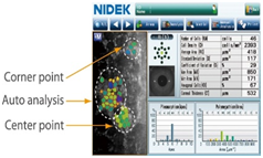 The international Diabetes Federation ‘IDF’ has listed Egypt as one of the top 10 countries in the world with diabetes.1 Hegazi et al.2 studied epidemiology and risk factors for Type 2 Diabetes in Egypt. In our study a non-contact specular microscope and optical pachymeter model Nidek CEM-5301 is being adopted. It is intended for studying the corneal endothelium and measuring the corneal thickness, with a capture field of 0.25 * 0.55 mm providing a wide field highly magnified image. It is provided with one central fixation lamp, 8 para-central fixation lamps, and 6 peripheral fixation lamps (Figure 2,3). Multiple photos that are captured are analyzed within seconds, automated analysis include different parameters of endothelial structure and two detailed graphic and color coded analysis including area graph for plotting polymegathism and apex graph for plotting pleomorphism. The device can offer advanced manual analysis and combined manual automated analysis to specifically select abnormal cells or to manually analyze photos using different methods either center point, corner point or pattern select or automated photo, trace, area and apex mode analysis (Figure 4).