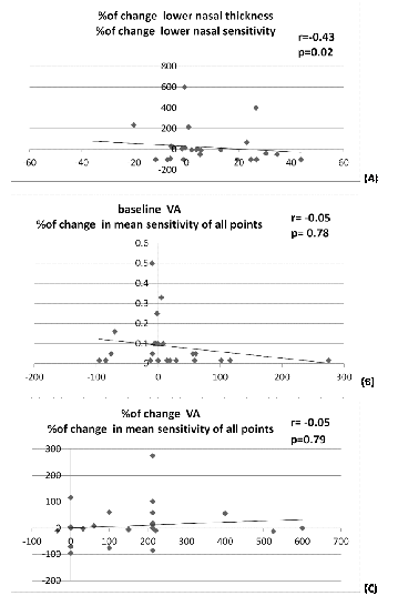 Figure 2 Line graph showing linear correlations between percentage of change in point thickness and percentage of change in point sensitivity of lower nasal quadrant (A),baseline visual acuity and percentage of change in mean point sensitivity (B), percentage of change in visual acuity and the percentage of change in mean point sensitivity (C).