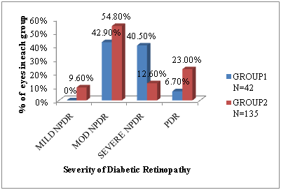 None of the biochemical parameters showed any statistically significant difference between the two groups as analysed by the Mann Whitney test. The median LOGMAR visual acuity in both groups was 0.48. Hence, there was no statistically significant difference in the visual acuity of eyes with or without serous retinal detachment. Group 1 consisted of no eyes with mild NPDR while Group 2 consisted of 13eyes (9.6%) with mild NPDR. Group 1 consisted of 18 eyes (42.9%) with moderate NPDR while Group 2 consisted of 74 eyes (54.8%) with moderate NPDR. Both the groups had 17 eyes (40.5% and 12.6% respectively) with severe NPDR. Group 1 had 7 eyes (16.7%) with PDR while Group 2 had 31 eyes (23%) with PDR. On comparing the severity of diabetic retinopathy in both groups using Chi-square test, the number of eyes with severe NPDR is significantly more in Group 1 as compared to Group 2 (P .001).