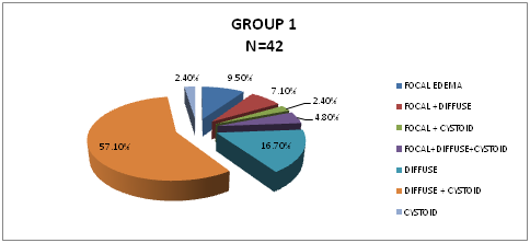 Group 1 had focal macular edema in 4 eyes (9.5%), diffuse macular edema in 7 eyes (16.7%), cystoid macular edema in 1 eye (2.4%), both focal and diffuse macular edema in 3 eyes (7.1%), focal with cystoid macular edema in 1 eye (2.4%), diffuse with cystoid macular edema in 24 eyes (57.1%) and all three patterns of macular edema in 2 eyes (4.8%).