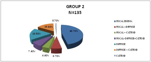 Group 2 had focal macular edema in 63 eyes (46.7%), diffuse macular edema in 25 eyes (18.5%), cystoid macular edema in 1 eye (0.7%), both focal and diffuse macular edema in 9 eyes (6.7%), focal with cystoid macular edema in 6 eyes (4.4%), diffuse with cystoid macular edema in 21 (15.6%) eyes and all three patterns of macular edema coexisted in 10 (7.4%) eyes.