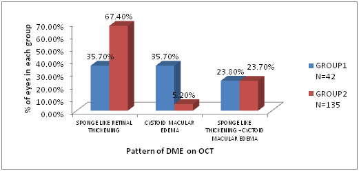 The difference between the 2 groups as analysed by Mann-Whitney test was statistically significant (p<0.001). Three main patterns of diabetic macular edema which were identified on OCT were: