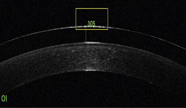 We used the 3 D OCT 2000 from the Topcon house giving measurements of the 305 micron post-contact tear meniscus in LE (Figure 3). Corneal touch is not observed in any of the radial cuts that our OCT allows us.