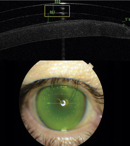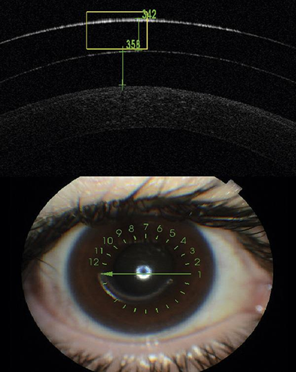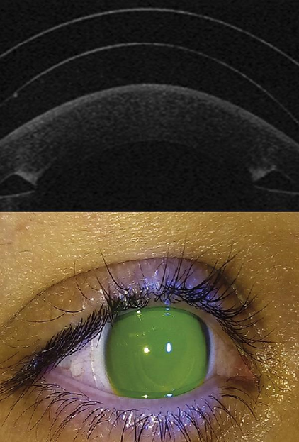 The postlent meniscus was 358 microns in OD as soon as the lens was inserted (Figure 5) and 306 microns in 5 hours of wear. The lens has no touch of the lens and totally saves the inserted segments. It should be noted that he had been on sick leave since keratoplasty and has currently been able to join his job by improving VA.