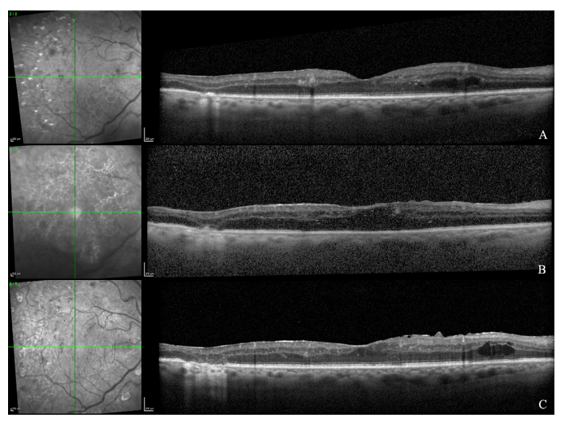 Figure 1 OCT of the OD at baseline (A), five days after PPV (B), and at the last follow-up (C).