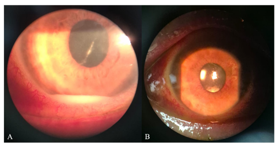 (A) Postoperative day 1: corneal haze, 2-mm inferior hypopyon, clear pupillary center, rubeosis iridis, and a centered IOL