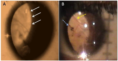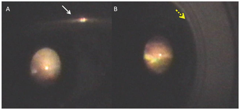 Figure 4 Estimation dynamic distance direct ophthalmoscopy photographs demonstrating (A) a superior bright (emmetropic) crescent in a 7 years old child wearing the spectacle (white arrow) and fixating at a distance of 6 meter and (B) +0.5D lens (yellow arrow) in front of the same child neutralising the emmetropic crescent.