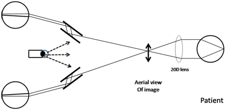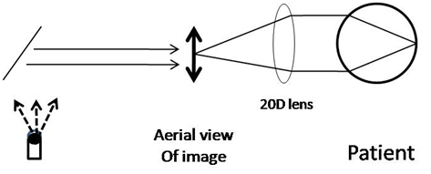 The direct ophthalmoscope produces an upright, or unreversed, image of the fundus with approximately 15 times magnification. For a good view, the ophthalmoscope needs to be used at a very close distance which can be very intimidating in some children and occasionally embracing socially. When used with a condensing lens such as a 20D lens, the image characteristic changes to what is seen with BIO. The image visualised in DIDO is inverted, laterally reversed and real. The optics of the DIDO and BIO (Figure 7&8) are similar.