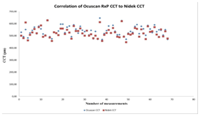 Nidek intraocular pressure-IOP with central corneal thickness-CCT(NT-530P) 16.23±3.69 mmHg. The correlation plot between central corneal thickness (Ocuscan) and (Nidek) revealed a statistically significant positive correlation (r=0.9; p=0.036). The graph shows that central corneal thickness /CCT/ measurements ranged between approximately 450 and 650 and the mean standard deviation measured with Ocuscan is 539,06±40,35 m and respectively with Nidek is 524,43±40,27 m. The correlation plot between the two devices revealed a statistically significant positive correlation –p=0,036. The plot between Goldman applanation tonometer and Goldmann applanation tonometry/central corneal thickness showed a weak correlation (r=0.47; p=0.51).