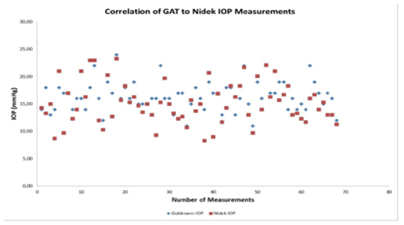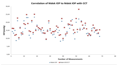 At baseline each patient had their intraocular pressure measured by Goldmann applanation tonometry and Nidek tonometer and the mean measurements are Goldmann applanation tonometry: 16.31±3.03 mmHg; Nidek: 15.2±3.74 mmHg. Intraocular pressure values are recalculated in order to account for the central corneal thickness/CCT/measurements. The calculations reveal the following results: