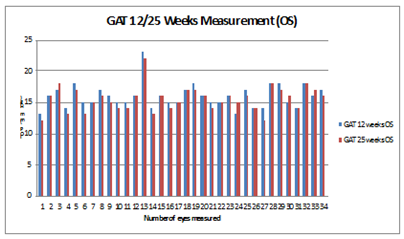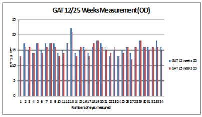 The intraocular pressure fluctuations measured using Goldmann applanation tonometry and intraocular pressure recalculated in accordance with the central corneal thickness values measured with Ocuscan demonstrated a weak statistical correlation. P=0,51. The next graph illustrates the correlation between Goldmann applanation tonometry and Nidek intraocular pressure measurements. The mean standard deviation of intraocular pressure values with Goldmann applanation tonometry is 16,31±3,03mmHg and 15,2±3,74mHg using Nidek. No significant correlation between Goldmann applanation tonometry and Nidek intraocular pressure measurements was established (r=0.54; p=0,06). Intraocular pressure measured with Nidek showed a distinct correlation to Nidek intraocular pressure/central corneal thickness values. p=0, 1. Intraocular pressure was also measured using Goldmann applanation tonometry /GAT/ on both eyes of each patient at follow up in 12 and 25 weeks (Graph 1-4). I would like to remind you that the mean Goldmann applanation tonometry /GAT/ at baseline was: 16.31±3.03mmHg;