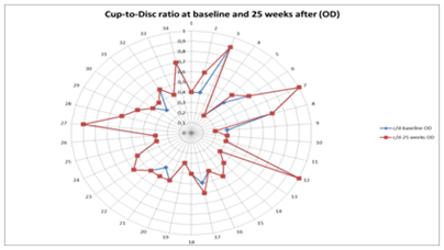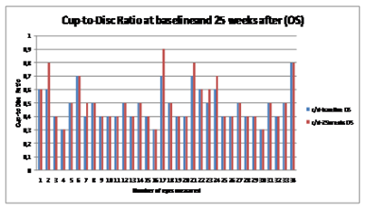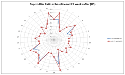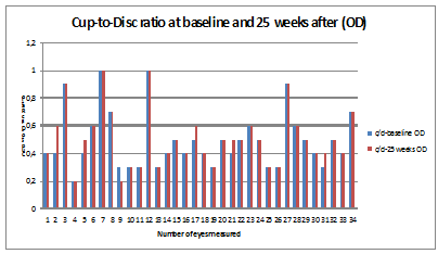 The result clearly showed extremely high correlation and was statistically significant, p=0,096. The derived data from c/d-baseline OD and c/d-25 weeks OD clearly showed extremely high correlation and were statistically significant (p=0.096; r=0.97). Similar data about c/d ratio at the baseline and after 25 weeks for the left eyes proved extremely high correlation and also were statistically significant, p=0.019