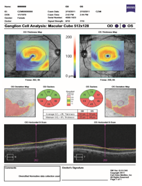 Then, in the macula region, an analysis of the ganglion cell complex is performed on average GCC thickness, hemifield GCC thickness, focal loss volume, and global loss volume. The measurement parameters are automatically compared with the normative database of OCT, and the results are color coded for "within normal limits" (green), "borderline" (yellow), and "outside normal limits" (red). Figure 2 shows a printout of ganglion cell analysis provided by a commercially available SD-OCT instrument the Cirrus-OCT (Carl Zeiss Meditec, Dublin, CA, USA) for a glaucomatous patient with decrease in average GCL + IPL thickness in all three inferior quadrants in the right eye and inferior and superotemporal quadrants in the left eye.