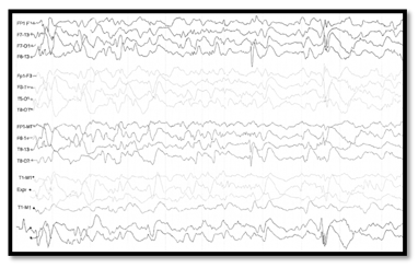A thirteen-month-old male child, his mother came with a complaint that the child is lacking eye contact and not holding things by himself. His birth history revealed that during his birth, due to poor road communication, his mother was in labour pain for four hours, and his birth weight was 2.9kg, delivered at 39 weeks with a lower segment caesarean section (LSCS). There was a delay in his birth cry for sixteen minutes, and from birth, he has had a history of seizures. His MRI report reveals symmetrical bilateral cerebrum subcortical and deep white matter hyperintensity with parieto-occipital lobe predominantly suggestive of hypoxic changes. His electroencephalography (EEG) revealed multifocal epileptiform activities with secondary generalization, as demonstrated in (Figure 4). Despite being put on multiple anti-epileptic medications, the patient continues to struggle with poorly controlled seizures. Our functional vision assessment revealed that he is unable to fix and follow light or objects. His anterior and posterior segment evaluations were within normal limits, and he did not respond to the Teller acuity card, indicating no perception of light. We advised him to undergo vision therapy for a period of three months. After three months, he could follow light only. We referred him to repeat the EEG, which revealed the findings. We continued the therapy for three more months, and after that, he started tracking fully illuminated objects only in a dark room. The presence of seizures can have a potential effect on the outcome of vision therapy. In this case, the child improved from Nutech Level 1 to Level 2, representing very minimal improvement.