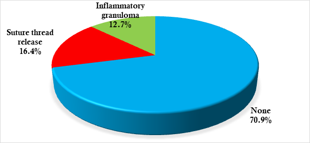 Considering the positive outcomes, complications may occur such as hypocorrection, overcorrection, corneal exposure, infection, inflammatory granuloma, and even suture thread release.1,17 In our series, we noted the suture thread release (16.4%) and the inflammatory granuloma (12.7%). Postoperative corneal exposure did not occur in any patient because of controlled surgery to avoid over-correction and by the routine placement of a lower eyelid traction wire at the end of the procedure to ensure eyelid occlusion within 24 hours of surgery. On the other hand, Maalouf and George18 had recorded 6 cases of serious keratitis in a series of 3500 cases of operated ptosis, including one case of corneal ulcer, 3 cases of corneal abscess, and 2 cases of keratitis which ended in evisceration. Regardless of the potential dangers of exposure keratitis, very few corneal problems have been reported in various research.19