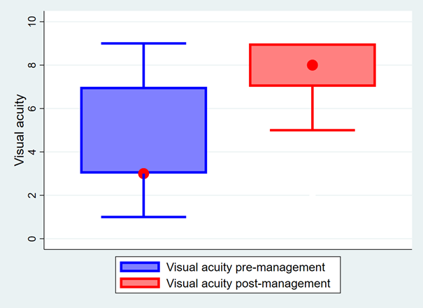 Eighty-one eyes from 77 consecutive patients underwent surgery for ptosis during the study period. The median age was 14 years (IQR: 12 – 28 years). Male sex was predominant (53.3%) with a sex ratio (M/F) of 1.1. No family history of ptosis was noted. Ptosis was congenital in 77.9% of the cases and acquired in 22.1%. History of ocular trauma was noted in 11 patients (14.3%). The most common reason for consultation was cosmetic discomfort in 63.6% of cases and vision loss was noted in 36.4% of cases. Ptosis was bilateral in 5.2% of the patients and 59.7% of the cases were left-sided. The degree of ptosis was moderate in 61% and major in 24.7%. As abnormalities associated with ptosis, 19.5% of the cases were associated with amblyopia, 11.7% with blepharophimosis syndrome, and 9.1% with congenital oculomotor muscle fibrosis syndrome; 59.7% of the cases were not associated with an abnormality. Management was achieved in 40.3% of the patients by upper eyelid levator resection, 31.2% by upper eyelid to frontal muscle suspension and 28.9% were untreated (Table 1). Postoperative complications noted were suture thread release (16.4%) and inflammatory granuloma (12.7%) (Figure 1). Median values for visual acuity were 3/10 pre-management and 8/10 post-management (Figure 2).