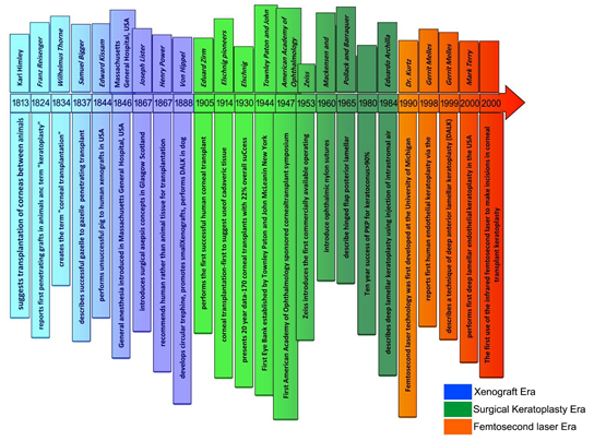 Corneal blindness is responsible for approximately 10% of blindness cases worldwide. More importantly, in most developing countries, corneal diseases represent the second leading cause of blindness. The history of corneal transplant surgery is an intriguing and fascinating story of more than 200 years duration filled with wild theories, animal experiments (xenograft), human trials, colorful adventurism, and serious clinical science. Early fascination with the idea of restoring clarity to an opacified cornea first emerged in the writings of Galen (130-200 AD), who suggested the concept of restoring the transparency of an opaque cornea. He recommended a form of superficial keratectomy (abrasio corneae). The initial corneal transplant was conducted in 1824, almost 190 years ago, by Reisinger. Thus, development of corneal transplant surgery can be divided into 3 eras: xenograft era, surgical era and femtosecond era.