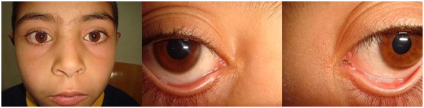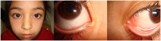 A 28-year-old male was admitted with epiphora in both eyes since birth. On examination, four of the punctal were found to be atretic. His 62-year-old mother was complaining of watering in both eyes and had absent right inferior punctum. The lacrimal irrigation test revealed obstruction on both sides. The patients two children, an 8-year-old girl and a 9-year-old boy, also had congenital epiphora, and all punctal were atretic in both children (Figure 1) (Figure 2). No coexisting oculofacial anomalies or systemic conditions were detected. In all the patients, there were mild depressions at the localizations of punctal, which were opened using a hypodermic needle and punctum dilator. Lacrimal irrigation test revealed patent nasolacrimal passage in the index patient. His mother received bilateral external dacryocystorhinostomy (DCR) with silicone tube intubation. Epiphora was resolved after the bilateral operation. Punctal openings were successfully performed in the two children, which revealed intact canaliculi. Lacrimal irrigation with fluorescein revealed patency on both sides in the boy and unilateral patency in the girl. During the follow-up, watering of the eyes resolved at the patent sides. The girl received external DCR, and the complaints regressed postoperatively. There were no recurrences at the end of the 3 years of follow-up.