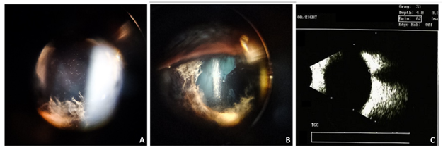 A 54-year-old female presented with pain, redness, and diminution of vision in her right eye for 10 days. She gave a history of undergoing uncomplicated standard phacoemulsification through 2.75 mm self-sealing clear corneal incision with foldable intraocular lens implantation 56 days back and post surgery she was on standard topical antibiotic and steroid regimen for one month. Her general physical examination and systemic workup were within normal limits. She was afebrile. No past history any other systemic disease. Systemic investigations to locate specific foci including blood, urine and cardiac evaluation were negative. Her best corrected visual acuity was 20/200 in her right eye and 20/20 in the left eye. The left eye examination was normal. The right eye showed deep anterior chamber (AC) with 2+ cells and flare and trace hypopyon. There was presence of hyphae-like structures floating in the AC inferiorly (Figure 1A, 1B). It was not possible to get the details of the posterior segment, however vitreous was found to be echo-free on ultrasonography B-scan (Figure 1C). Considering the morphology of the hyphae-like structures, a provisional diagnosis of fungal anterior uveitis was made. Diagnostic AC tap was done and AC lavage with voriconazole was done. Lactophenol cotton blue stain of the AC fluid revealed fungal hyphae (Figure 2A). Initial AC fluid grew Fusarium sp. on Sabouraud’s dextrose agar (SDA) (Figure 2B, 2C). The patient was started on oral fluconazole 400 mg initial dose followed by 200 mg daily, topical 1% voriconazole eye drops every hour and 1% atropine sulphate eye drops three times a day. Over the next one-month period there was gradual regression of hyphae and resolution of AC reaction. The patient’s vision improved to 20/40 and there was no inflammation or evidence of recurrence 1 year after the treatment.