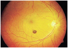 This type of tumor (simple congenital hamartoma of the retinal pigment epithelium (RPE) is a fairly rare lesion of low prevalence. Diagnosis is usually made casually in healthy and asymptomatic children, as well as in young adults, during a routine fundoscopy in general ophthalmological consultation. Optical Coherence Tomography (OCT) has recently become an important tool for the evaluation of retinal anatomy and retinal abnormalities. Few reported cases have been written about the role of OCT in the evaluation of ocular tumors¹. In this report, we describe the OCT findings of this highly pigmented retinal tumor.