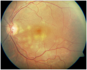 Figure 1A Color Fundus Retinography of left eye shows multiple loci of choroidal exudation in a case of Harada disease.