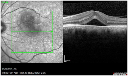 Caucasian woman aged 22 who attends derived from another center with a diagnosis of unilateral CRCS after abruptly presented severe decrease in visual acuity (VA) in her left eye.Do not have a personal or family history of interest. The picture is not accompanied by systemic signs or symptoms. On examination, VA is 20/20 in her right eye and counting fingers in her left. The IOP is normal in both eyes. The anterior segment examination shows no signs of inflammation. The fundus examination shows a brightening of the internal limiting membrane in the posterior pole of both eyes and a macular neurosensory detachment with a brownish hue in the left eye (Figure 2A&2B). The FA shows hyper fluorescent macular lesion in the right eye with multiple hyper fluorescent spots inside, taking a look of “starry night”, and hyper fluorescence of the optic disc in both eyes (Figure 2C&2D). The OCT of the right eye shows large loculated neurosensory detachment in the macular area. The OCT of the left eye shows neurosensory detachment (Figure 2E& 2F).