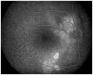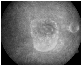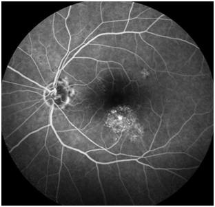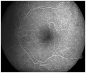 Figure 2C FA of right eye shows disseminated spotted choroidal hyper fluorescence and choroidal hypo fluorescence in macular area.