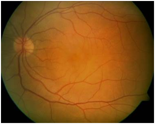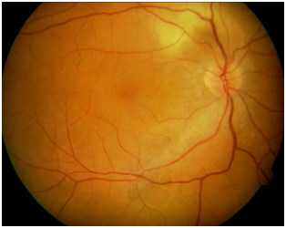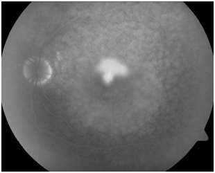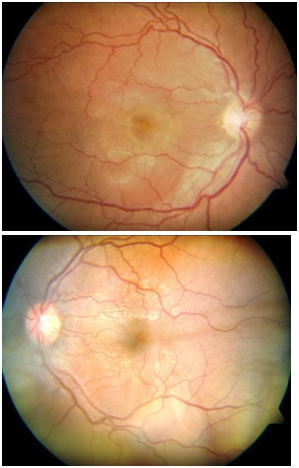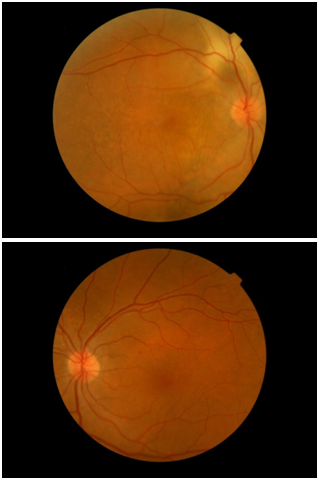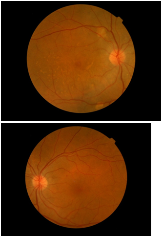 Figure 2A & 2B, Retinographies showing choroidal exudation and increased brightness from the ILM in posterior pole of both eyes.
